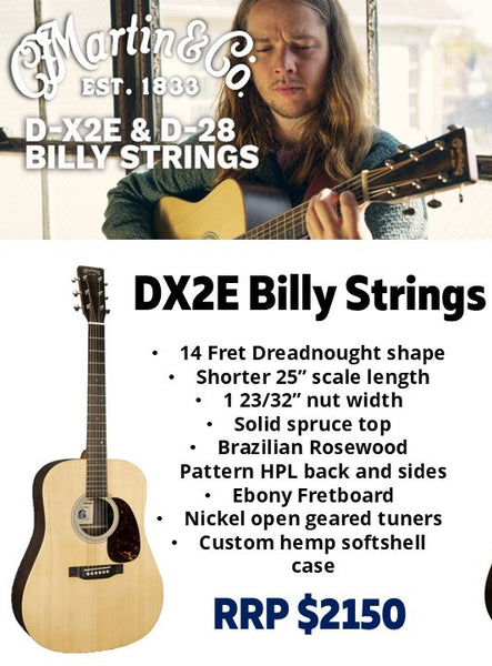 The Martin D-X2E Billy Strings takes inspiration from Billy's love for his pre-war D-28 while offering a more accessible option for fans and players alike. It features the same unique 25” scale length and custom nut width as its high-end counterpart, making it easier to play fast, intricate lines while maintaining a comfortable feel. Built with durable Brazilian rosewood-patterned HPL back and sides and a solid spruce top, this Dreadnought delivers a powerful, booming tone that's perfect for both traditional and modern acoustic styles. Nickel open gear tuners, an ebony fingerboard with faux abalone inlay, and a style 28 rosette add a classic touch, while Martin E1 electronics and a built-in tuner ensure it's ready for the stage. Complete with a hemp softshell case, the D-X2E Billy Strings is a rugged, reliable instrument that reflects his passion for pushing boundaries and blending genres. Each guitar features a custom paper label with Billy's pre-printed signature and graphic.