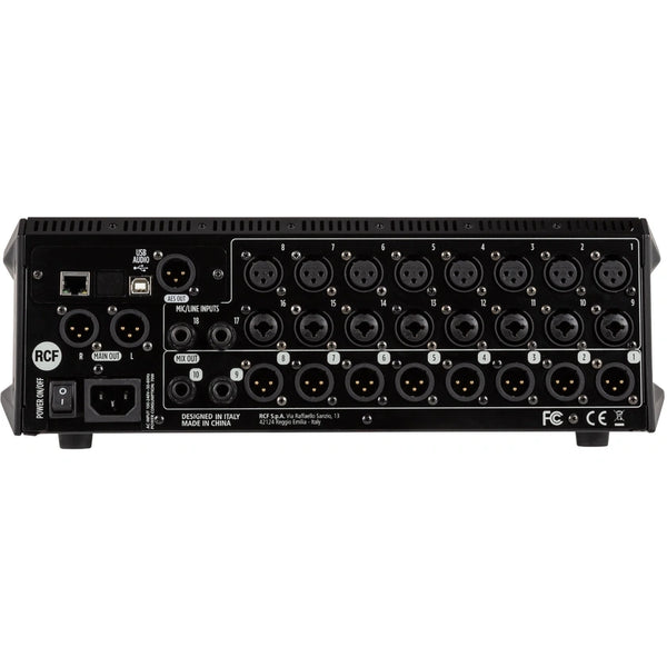 The RCF M 20X Desktop Digital Mixer is a fully recallable mixer, with 16 remote controlled preamps and 11 motorized faders. Despite its dimensions, the M 20X packs a whole suite of capabilities, such as high-profile preamplifiers, top of class DSP with studio-quality processing, WiFi remote control and a comprehensive set of multitrack recording and playback functions. The mixer offers a total of 20 analog inputs and 14 output channels, between the balanced analog outputs and the AES/EBU digital output.