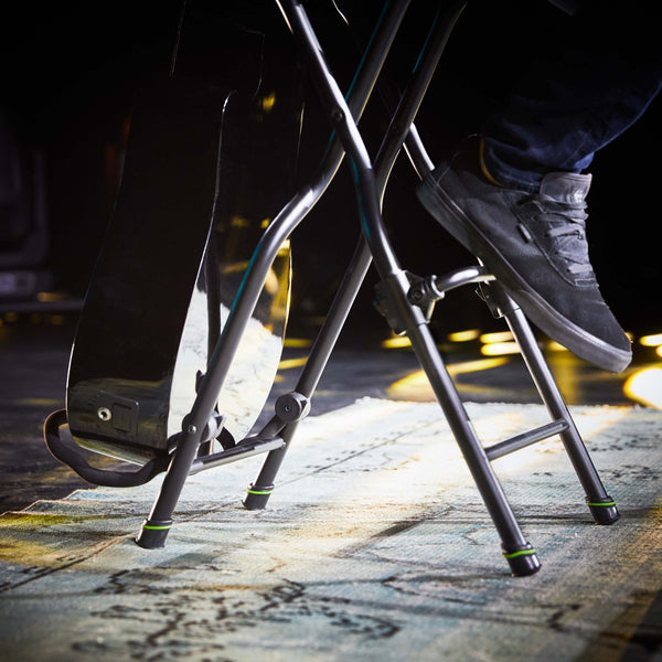 The guitar bar stool is a round musician seat designed for guitarists, bassists and singer-songwriters. It boasts several of Gravity's special hallmark features. Firstly, there is the design and functionality of the seat: It is made from a combination of leatherette and fabric. This ensures that the seat surface is breathable at the right places, which significantly increases sitting comfort. This combination also gives the stool a unique and appealing design.