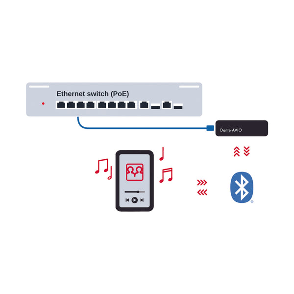The Dante AVIO Bluetooth adapter provides wireless connectivity to Dante networks for mobile devices and computers. It is ideal for both playback from smartphones to larger sound systems, and for connecting networked speakers and microphones to conferencing software.