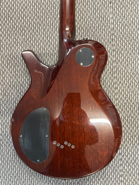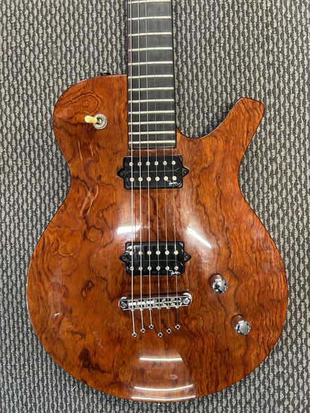 The Parker PM-20 'Hornet' is a seriously cool guitar! This model features a Quilted Bubinga top on a Mahogany body, a Mahogany neck, and an Ebony fingerboard. It has a 25.5" scale length and weighs around 8 pounds.